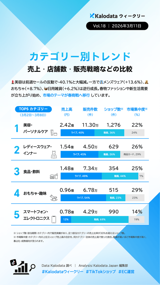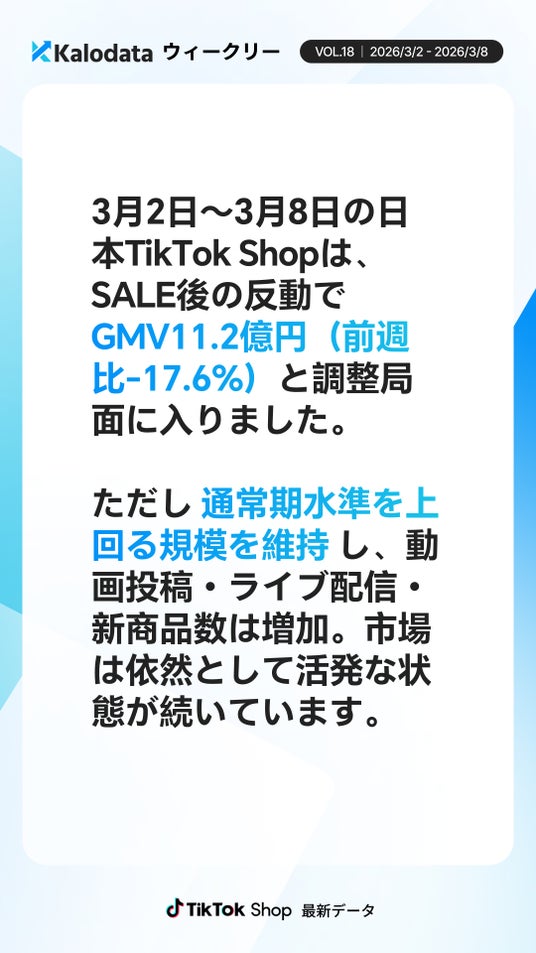 TikTok Shopデータ分析サービスKalodata Japan(運営:株式会社Kalowave Japan)の最新データによると、2026年3月2日~3月8日の日本TikTok Shop市場は前週の大型セールの反動によりGMV11.2億円(前週比−17.6%)となりました。一方、動画投稿・ライブ配信数は増加し、市場活動は依然活発です。カテゴリー別では美容が大きく調整する一方、メンズウェア・玩具・日用雑貨が成長し、春商戦の立ち上がりが確認されました。