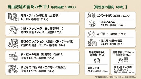 自由記述(300人分)を全体的に見ると、写真・アルバム、手紙、趣味のコレクション、親や故人の形見、子どもの作品などが多く語られていました。