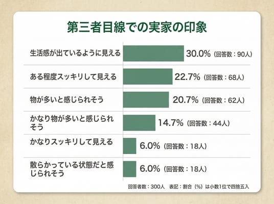 第三者が見たとき、実家の物の状態がどう見えると思うかを聞くと、生活感や物量への意識が分かれました。