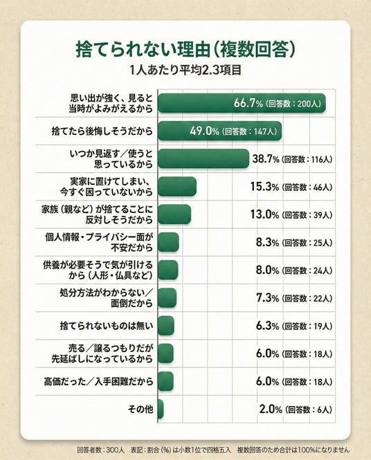 【結果2】捨てられない理由は思い出66.7%(200人)、後悔しそう49.0%(147人)が上位(複数回答)