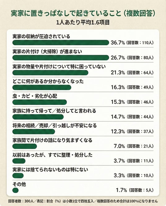 ・実家に置きっぱなしで起きていることは収納が圧迫36.7%(110人)が最多