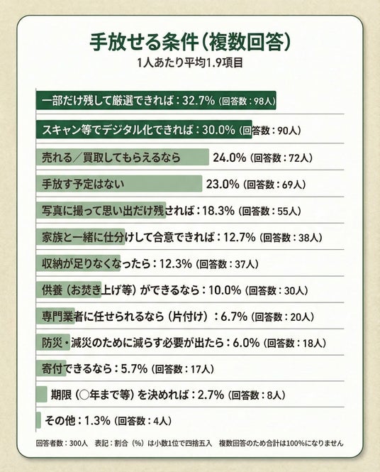 ・手放せる条件は一部だけ残して厳選できれば32.7%(98人)、デジタル化できれば30.0%(90人) ・第三者目線では生活感が出ているように見える30.0%(90人)が最多