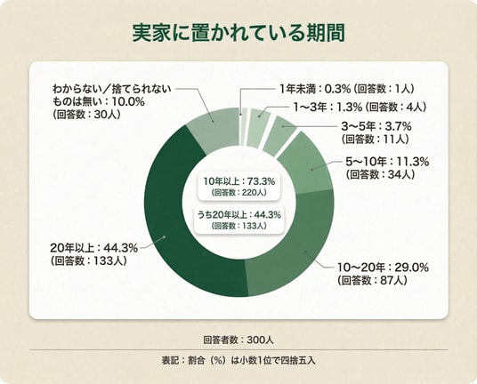 捨てられないもの上位は、写真・アルバムや卒業アルバム、手紙など思い出系が中心。さらに、実家に置かれたままの期間は10年以上が73.3%(220人)で、うち20年以上が44.3%(133人)と、長期化している実態が見えてきました。