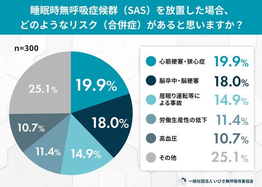 「いびきがうるさい」「日中どうしようもなく眠い」――。これらは単なる疲れのサインではなく、深刻な病「睡眠時無呼吸症候群(SAS)」の予兆かもしれません。一般社団法人 いびき無呼吸改善協会は、一般の方300名を対象に「睡眠時無呼吸症候群(SAS)に関する調査」を実施しました。その結果、心筋梗塞や脳卒中といった重大な合併症のリスクは広く知られている一方で、実際に「息が止まっている」と指摘されても半数以上の人が「様子見」を選択するという、対策の“落とし穴”が明らかになりました。