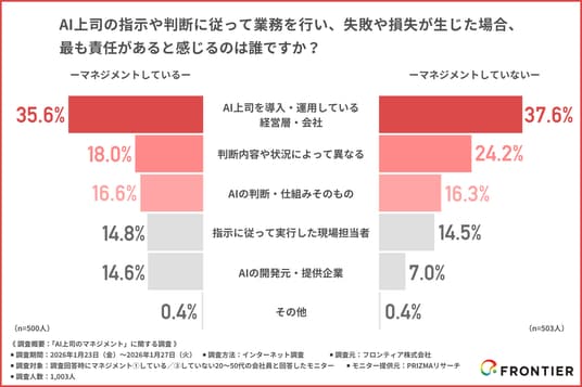 「AI上司の指示や判断に従って業務を行い、失敗や損失が生じた場合、最も責任があると感じるのは誰か」について尋ねたところ上司と部下で意見が完全に一致しました。