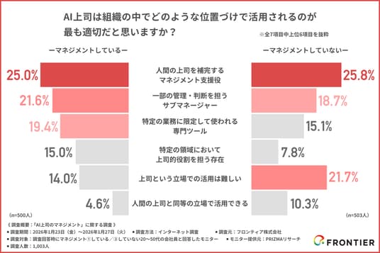 本調査では、回答者を「マネジメント層(部下を持つ上司/n=500)」と「非マネジメント層(部下を持たない一般社員/n=503)」の2つの属性に分類。「AIが上司になること」への意識差を比較分析した結果、現在の立場や業界によって統計的に乖離があることが明らかになりました。