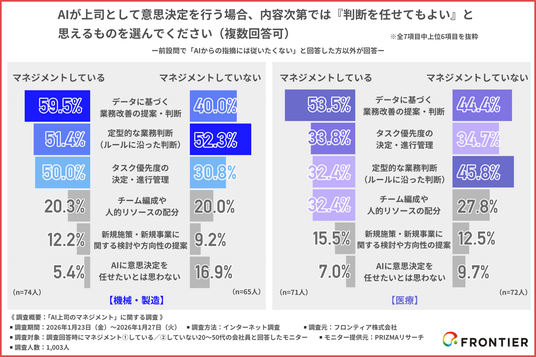 機械・製造業では、マネジメント層の約6割が「データによる改善」や「業務プロセスの最適化」といった上流の判断をAIに任せたいと考えているのに対し、非マネジメント層は『定型的な業務判断』など、日々の負担を軽減する役割をAIに期待しています。