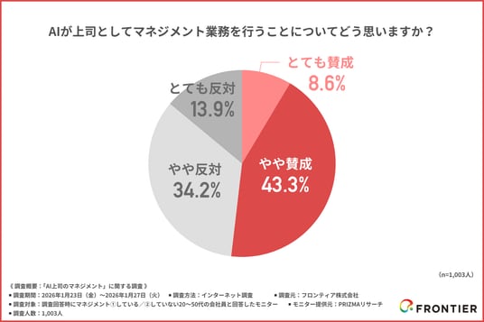 フロンティア株式会社(本社:東京都渋谷区、代表取締役社長:高橋 政裕)は、20~50代の会社員1,003名を対象に、「AI上司のマネジメント」に関する調査を行いました。
