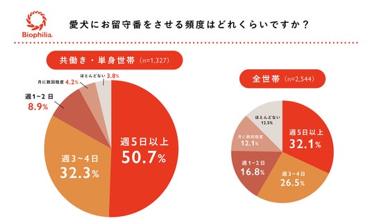 愛犬愛猫向け手づくりごはんブランドなどを展開する株式会社バイオフィリア(本社:東京都新宿区、代表取締役:岩橋洸太、以下、当社)は、愛犬の留守番実態と、それに伴う飼い主の見守り行動の実態を明らかにすることを目的に、全国の犬と暮らす飼い主さま2,544名を対象に、「愛犬の留守番と睡眠」に関する実態調査を行いました。また、本調査では、家を空ける機会が発生しやすい「共働き世帯・単身世帯(1,327名)」を抽出し、働き方と愛犬の留守番・見守り行動との関係についての傾向も分析しています。