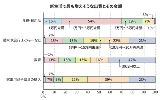 - 新生活で出費の増加を予想しているかたは約7割。出費が増えそうな項目では「食費・日用品費」が最多で、過半数が月1万円~3万円増を見込む。一方「趣味や旅行」「教育」「家電や家具の購入」では10万円以上の増額を想定する人も多く、項目ごとに増加額に差が。