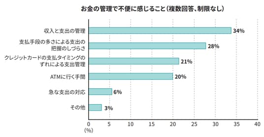 お金の管理で不便に感じていることをうかがったところ、最も多かったのは「収入と支出の管理」で34%でした。続いて、「支払手段の多さによる支出の把握のしづらさ」が28%、「クレジットカードの支払タイミングのずれによる支出管理」が21%となり、支出額の把握に関する不便さを挙げる回答が上位を占めました。また、「ATMに行く手間」と回答したかたも20%に上り、キャッシュレス化が進む中で、必要な現金を用意する際の不便さを感じているかたが一定数いることがわかります。