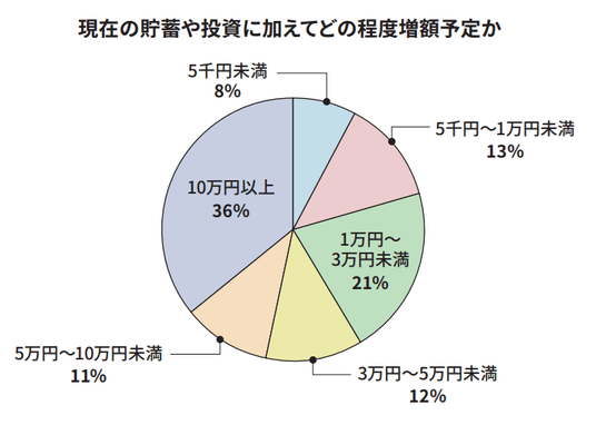 この春に見直したいこととして、「貯蓄、投資の習慣」、「趣味や旅行、レジャーなどの費用や教育」が最も多く28%、「食費・日用品費用の見直し」、「投資金額の見直し」が次いで26%となりました。貯蓄や投資などのお金を「貯める」習慣や金額の見直し、生活や趣味・日常の出費に係る支出の見直しのふたつに大きく分かれる傾向が見られます。さらに、「貯蓄・投資の習慣」または「投資金額」を見直したいと回答した人のうち、どの程度増額予定かうかがったところ、最も多かったのは「10万円以上」で36%、次いで「1万円~3万円未満」が21%となりました。約6割のかたが、3万円以上を貯蓄または投資の増額を検討している結果となりました。