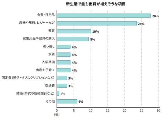 新生活に伴い出費が「増えそう」と回答したかたは67%に上り、そのうち、最も出費が増えそうな項目は「食費・日用品」が28%、次いで「趣味や旅行、レジャーなど」が24%と、この2項目で5割を占める結果となりました。その他、「教育」が10%、「家電・家具の購入」が9%と、進学や新生活に伴う出費の増加を予想する回答が続きました。