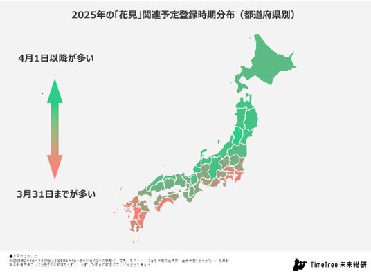 - 花見予定の登録時期は南から北へと遅くなり、桜の開花時期と連動する傾向