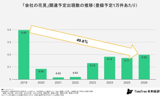 株式会社TimeTree(本社:東京都新宿区、代表取締役社長:深川 泰斗)の社内研究所『TimeTree未来総合研究所』(https://timetreeapp.com/intl/ja/future-research-institute)は、春の風物詩である「花見」に関する予定登録データを分析しました。分析の結果、花見予定はコロナ禍以降回復傾向にあり、2026年は2020年以降で最多となったものの、2019年と比較すると約6割の水準にとどまっていることが分かりました。