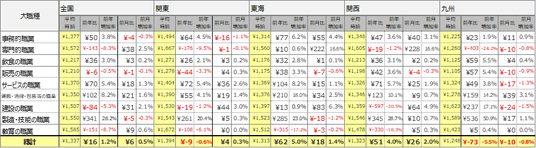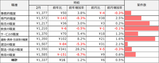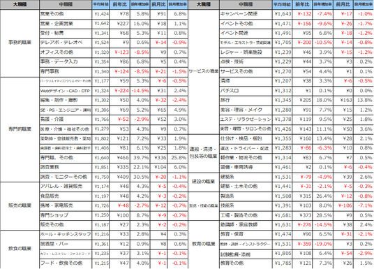 事務的職業は1,377円(前年比50円増、前月比4円減)、専門的職業は 1,572円(前年比143円減、前月比38円増)、飲食の職業は1,217円(前年比36円増、前月比3円増)、販売の職業は1,210円(前年比6円減、前月比1円減)、サービスの職業は1,370円(前年比70円増、前月比18円増)、運搬・清掃・包装等の職業は1,350 円(前年比102円増、前月比21円増)、建設の職業は1,507円(前年比84円減、前月比31円増)、製造・技能の職業は1,550円(前年比341円増、前月比5円減)、教育の職業は1,585円(前年比151円減、前月比9円増)となりました。