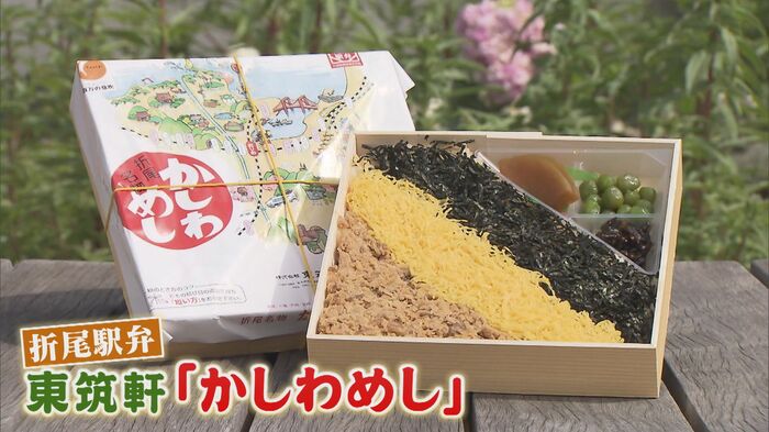 甘く煮た鶏そぼろと、ふわふわの錦糸卵。鶏のスープで炊き上げた秘伝の炊き込みご飯は、大正時代から変わらぬ味わいだ。東筑軒が、大正時代から続ける立ち売りスタイルで、出来立ての味を届け続けている。