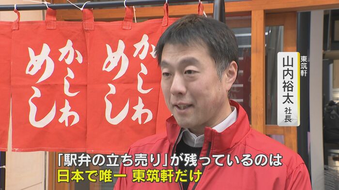 山内裕太社長(41)は「駅弁の立ち売りが残っているのが、日本で唯一、東筑軒だけなので、その気持ちや思いも含めて『我々が終わらせるわけにはいかない』と思っている。まだまだ『東筑軒を知らない』という人がいっぱいいると思うので、福岡の天神、新天町で東筑軒に触れて頂いて『福岡県民のソウルフード』になっていけたら」と熱く語る。