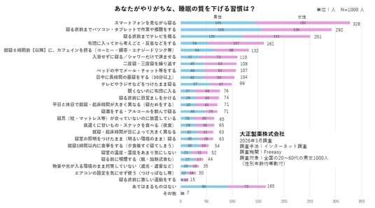 大正製薬株式会社が2026年3月に全国の20代~60代の男女1000人を対象に行ったインターネット調査によると、「やりがちな睡眠の質を下げる習慣」の上位5つは、「スマートフォンを見ながら寝る」(328人/1000人、以下同)、「寝る直前までパソコン・タブレットで作業や視聴をする」(292人)、「寝る直前までテレビを見る」(251人)、「布団に入ってから考え事・反省などをする」(161人)、「就寝6時間前【以降】に、カフェインを摂る(コーヒー・緑茶・エナジードリンク等)」(132人)となっていました。