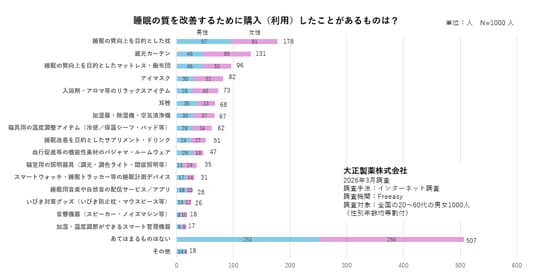 また、「睡眠の質を改善するために購入(利用)したことがあるもの」に関しては、1位が「睡眠の質向上を目的とした枕」(178人)、続いて「遮光カーテン」(131人)、「睡眠の質向上を目的としたマットレス・敷布団」(96人)、「アイマスク」(82人)、「入浴剤・アロマ等のリラックスアイテム」(73人)という結果です。