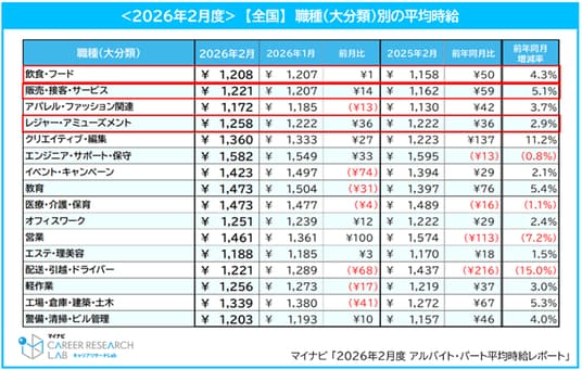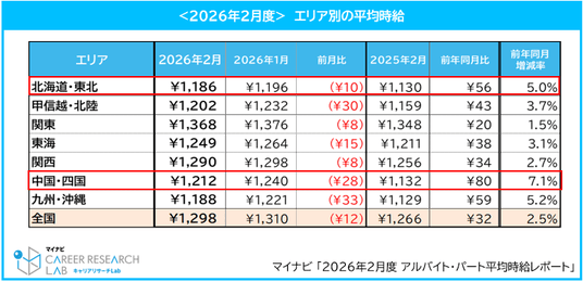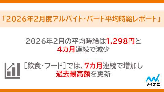 株式会社マイナビ(本社:東京都千代田区、代表取締役 社長執行役員:粟井俊介)は、「2026年2月度アルバイト平均時給レポート」を発表しました。本調査は、アルバイト・パート求人情報サイト『マイナビバイト』(https://baito.mynavi.jp/)に掲載された求人広告データを集計したものです。