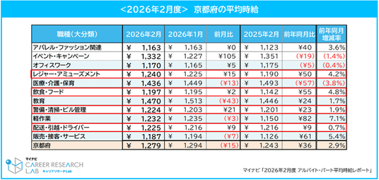◆【今月のTOPIC】2026年3月に宿泊税が引き上げられた「京都府」に注目。京都の平均時給は、1,279円で前年同月から36円増