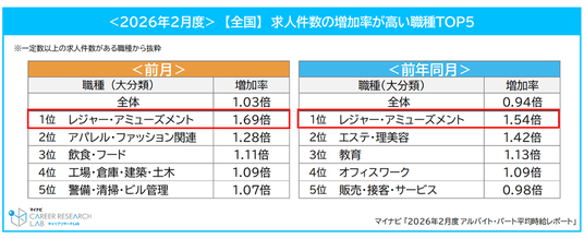 特に[レジャー・アミューズメント]では、求人件数が前月比で1.69倍、前年同月比で1.54倍と大きく増加しており、時給と求人数の双方にその動きが表れていると考えられる。この職種は夜勤業務が発生するなど、年齢要件を含む募集規則が設けられるケースも多いことから、受験シーズン終了を前に、春先に向けて大学生アルバイトを早期に確保しようとする企業側の意図もうかがえる。