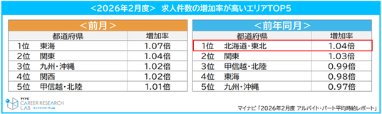 エリア別平均時給では、「中国・四国」が1,212円となり、前年同月(1,132円)から80円増加し、全エリアの中で最も増加額が大きかった。次いで「九州・沖縄」が1,188円(前年同月比:59円増)、「北海道・東北」が1,186円(前年同月比:56円増)となった。