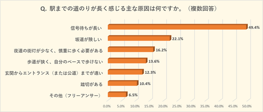 2)合計41.1%が物件情報の「駅徒歩分数」より実際は長く感じると回答。主な原因は「信号待ち(49.4%)」。