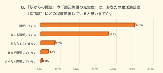 1)87.2%の方が「駅からの距離や周辺施設充実度」の項目が生活満足度(幸福度)に影響すると回答。