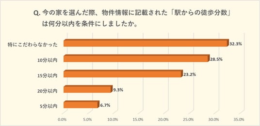 「特にこだわらなかった」32.3%が最も多く、最寄り駅への依存度は大きくないことが分かりました。利便性が高い「5分以内」を条件とする人は僅か6.7%に留まり、多くの方が10~15分以内をひとつの目安としています。