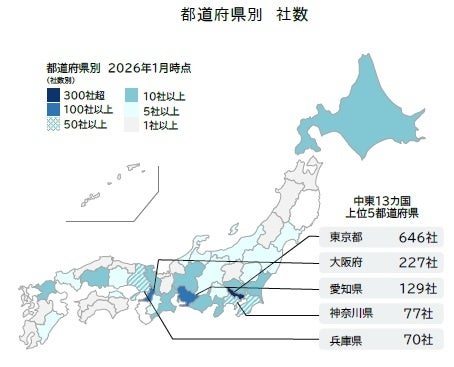 2026年1月時点における、中東13カ国で進出・輸出入などで事業・ビジネスを展開する日本企業は1515社判明した。このうち、企業数は「アラブ首長国連邦(UAE)」が最多の709社、次いで「イスラエル」473社、「サウジアラビア」268社。業種別では卸売業が6割弱(58.3%)、製造業が2割を占めた。都道府県別では、東京・大阪・愛知の3都府県で6割超を占める。