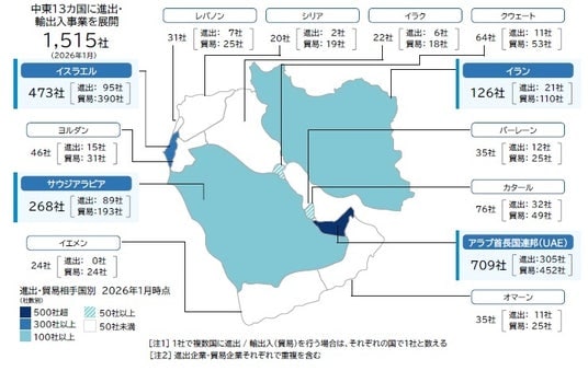 パレスチナを除く中東地域13カ国に進出、または輸出入(貿易)事業(=「中東事業」)を展開する日本企業は、2026年1月時点で少なくとも計1515社が判明した。このうち、駐在拠点や工場など現地に「進出」している企業は469社、輸出入など「貿易」を行う企業は1137社判明した(「進出」「貿易」でそれぞれ重複を含む)。