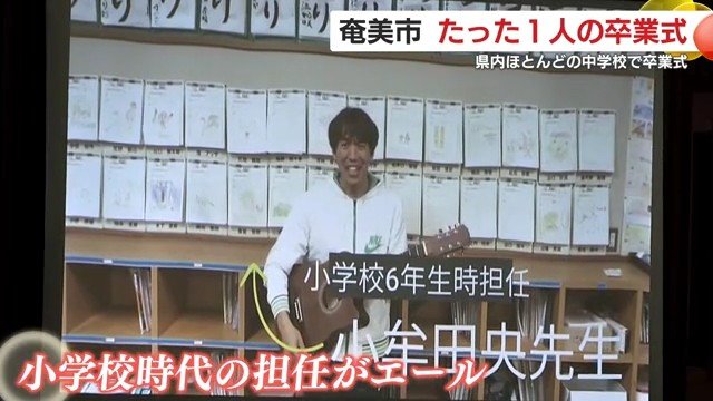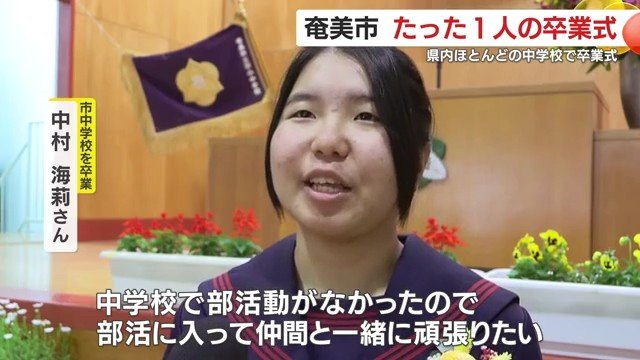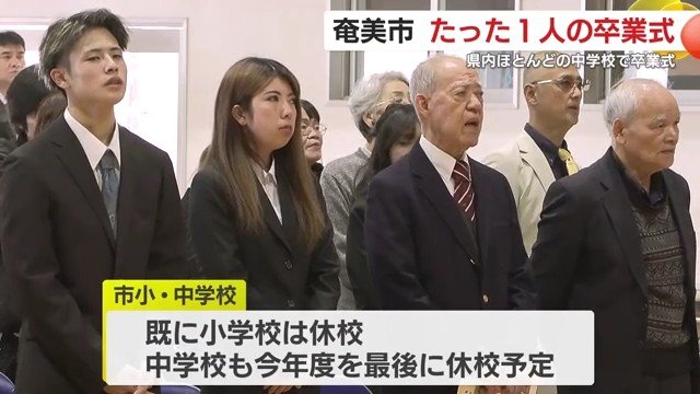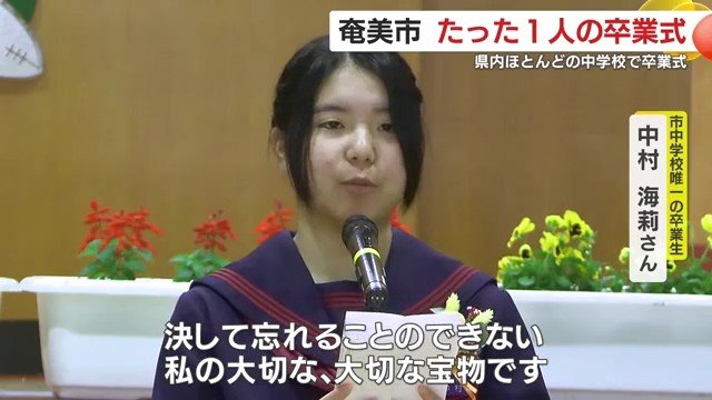 奄美市住用町の市中学校で、全校生徒ただ1人の卒業式が行われた。卒業生は中村海莉さん1人。在校生もおらず、同校唯一の生徒が学び舎を後にした。2025年度を最後に休校予定の学校で、静寂の中にも温かな感動が包んだ特別な式典となった。