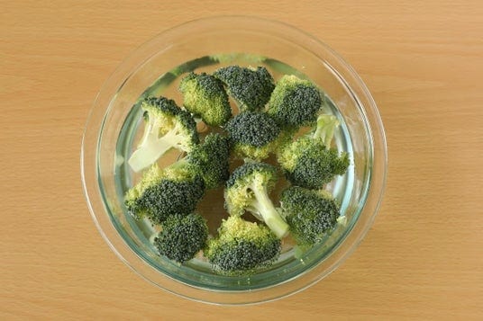 ブロッコリーは茎やつぼみ部分に虫やゴミなどが入りやすいので、小房に切ってから洗うのがおすすめ。調理直前にボウルに張った水に数分つけるとゴミなどが浮いてきます。もしくは、ボウルの中でブロッコリーの茎を持ち房の部分を水の中で振り洗いして、いずれも2~3回流水でしっかりと洗いましょう。