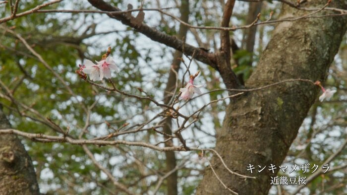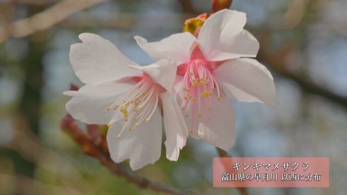日当たりの良い高台近くで発見されたキンキマメザクラは、富山県の早月川を境に本州西側の山林に自生する桜の野生種だ。その淡いピンクの花がほころび始める様子は、まさに春の到来を告げる自然のメッセージといえる。