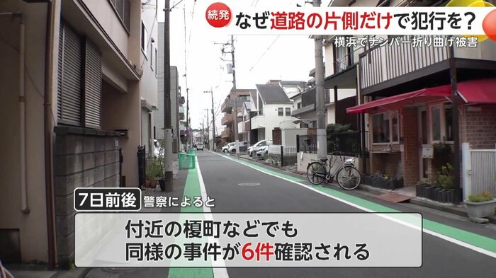 被害は一方通行の道路沿いに集中し、同一犯による器物損壊とみられる。