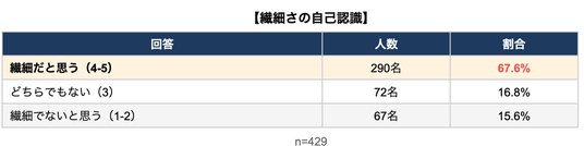 約7割の人が「自分は繊細だ」と自己認識しています。繊細さは決して少数派の特性ではなく、多くの人が自分の中に繊細な面を感じていることがわかります。