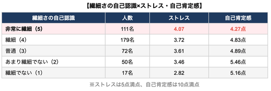 「非常に繊細」な人はストレスレベルが4.07と最も高く、自己肯定感は4.27点と最も低い結果です。繊細さは個性ですが、適切なセルフケアやストレス対策が重要であることがわかります。