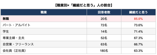 調査結果5. 職業別:無職の85%が「繊細」と回答