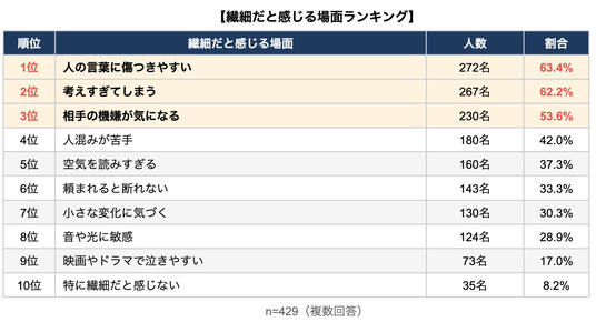 「自分が繊細だと感じるのはどんな時ですか?」(複数回答)を尋ねたところ、「人の言葉に傷つきやすい」が63.4%で1位となりました。