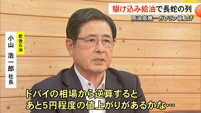 肥後石油の小山浩一郎社長は「きのうまでは来週3月19日から、さらに17円相当上がるだろうと思っていた。午後7時半の報道で上がらないと思った。ドバイの相場から逆算すると、あと5円相当の値上がりがあるかな、日々変わるが…。上がっても5円だからゆっくり給油しに来てほしい」と話す。