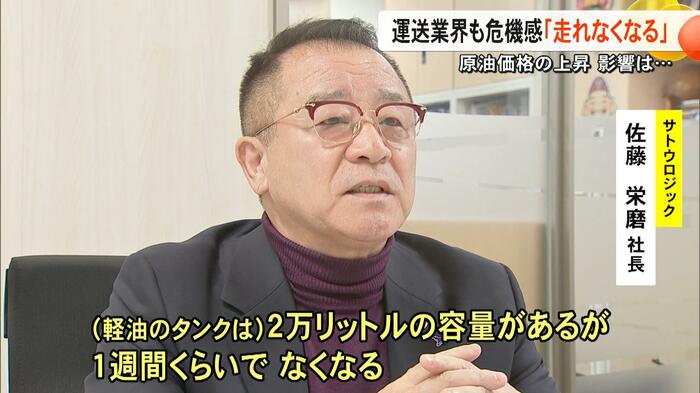 菊池郡大津町に本社を置き半導体精密機械などの配送を行うサトウロジックでは、約70台のトラックを所有し、毎月7万1000リットルの軽油を使っていることから、このまま高値が続くと、年間約4000万円、経費が増えると予想している。