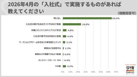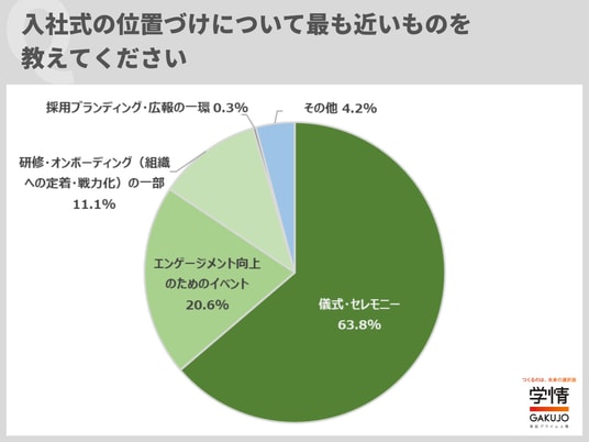 入社式の位置づけは、「儀式・セレモニー」が63.8%で最多でしたが、「新入社員のエンゲージメント向上のためのイベント」が20.6%、「研修・オンボーディング(組織への定着・戦力化)の一部」も11.1%で、3割を超す企業が単なる儀式ではなく、新入社員の定着などに向けた内容を意識していることが分かりました。