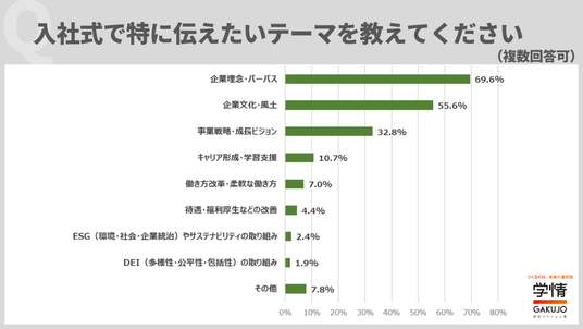 入社式で特に伝えたいテーマを尋ねた(複数回答可)ところ、「企業理念・パーパス」が69.6%で最多、次いで、「企業文化・風土」55.6%、「事業戦略・成長ビジョン」32.8%が続きました。さらに、「キャリア形成・学習支援」10.7%、「働き方改革・柔軟な働き方」7.0%など、社員支援や働き方などの取り組みについての説明を重視する企業もありました。