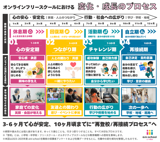 aini schoolでは、無理に外へ出ることや、すぐに結果を求めることはしていません。家庭から参加できる安心な環境の中で、まずは心の安定と人とのつながりを育むことを重視しています。その“内側の変化”が整った先に、登校再開や新しい学びの場への一歩が自然と生まれると確信しています。今回の結果を通じて、オンラインフリースクールという学びの形が持つ本当の価値を、より多くの方に知っていただけたら嬉しいです。