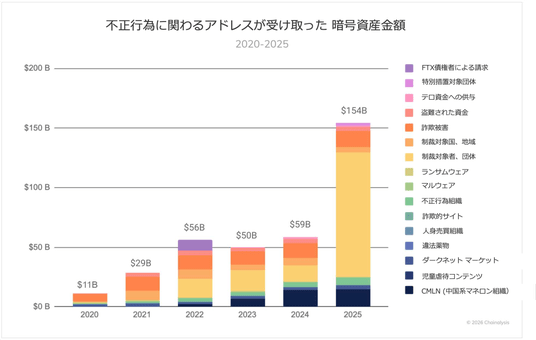 本レポートによれば、2025年に 不正な活動に利用される暗号資産アドレスが受け取った資金は、少なくとも1540億ドル(前年比162%増)に達し、その多くを占めたのは制裁対象団体への送金でした。