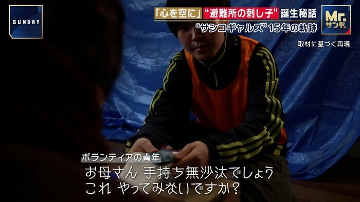(ボランティアの青年に)救われたっていう言葉っていうか、やることができたっていうかさ。さしこやってると(嫌なことを)忘れます。