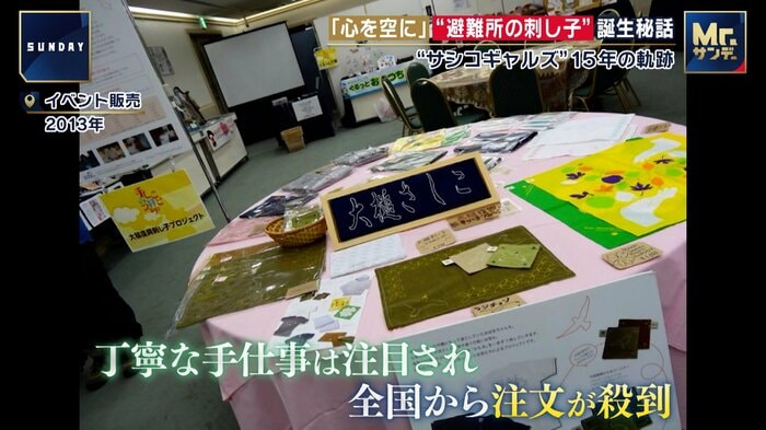 「大槌復興刺し子プロジェクト」の初めの作品は、「コースター」や「布巾」と言った簡単なものだったが、彼女たちの丁寧な手仕事は復興支援の中で注目され、全国から注文が殺到した。