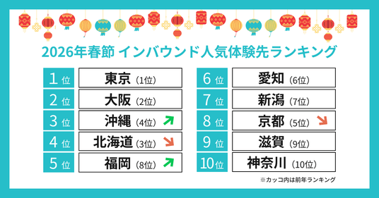 アジア最大級のオプショナルツアー予約サイトを運営する株式会社KKDAY JAPAN(読み方:ケーケーデイジャパン、所在地:東京都新宿区、支社長:大淵公晴、以下「KKday」)は、世界75万人以上のユーザーが利用するKKdayの予約件数データをもとに、2026年の春節(旧正月)休暇で日本を訪れるインバウンド旅行者に人気の都道府県ランキングを発表しました。本調査により、1位東京、2位大阪、3位沖縄、4位北海道、5位福岡であることが明らかになりました。
